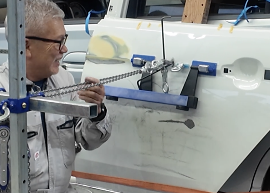 ドアパネルに損傷を付け、修理手順・使用工具・注意点・ポイント説明、及びプーリング(タブでの引き出し鈑金)での雹害、エクボ修理を共有しながらの講習会になりました。