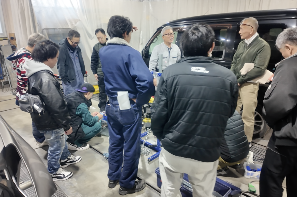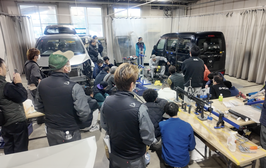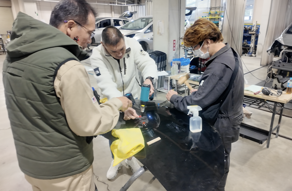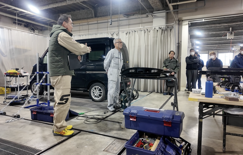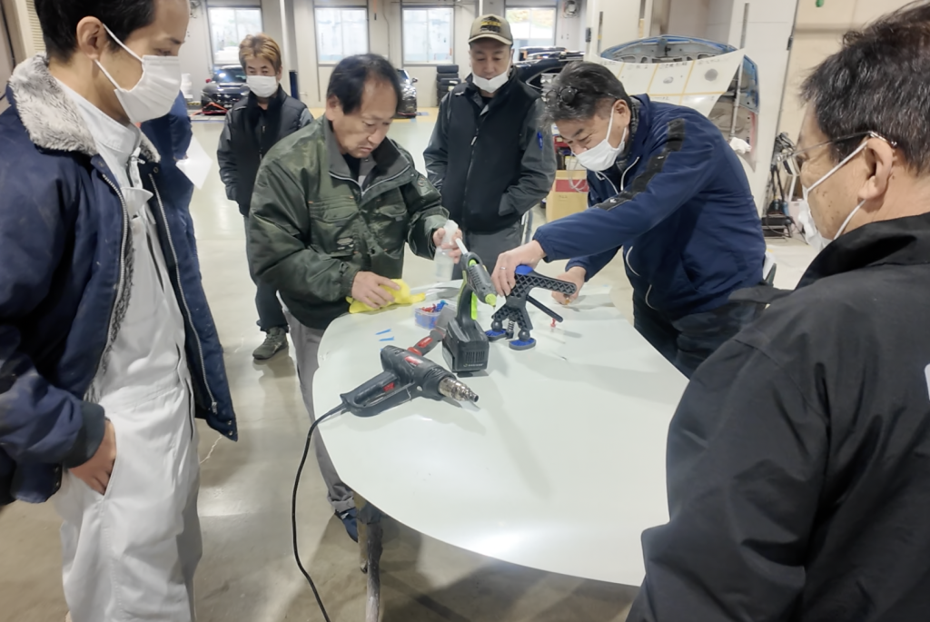 後半は参加者全員で、エクボ・雹害損傷をプーリングでパテを使わない引き出し修理方法の